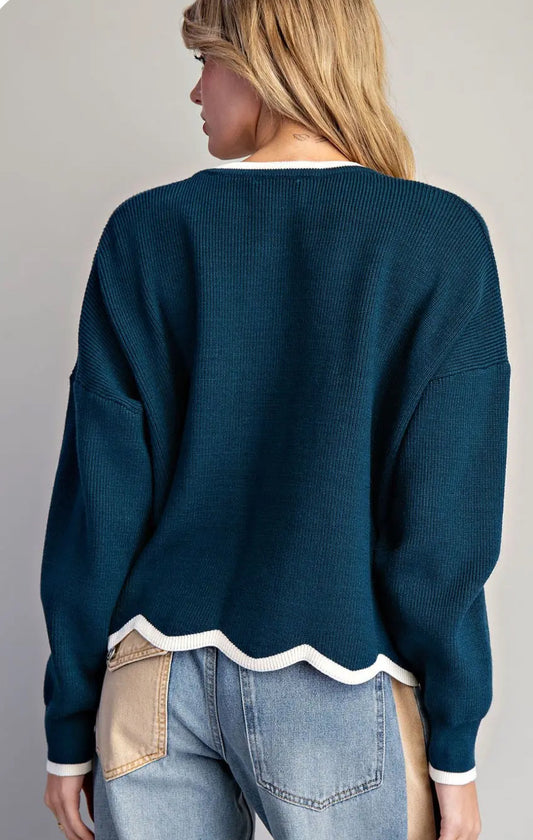 Contrast teal scallop trim sweater